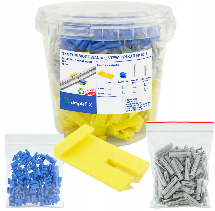 System mocowań do listew tynkarskich firmy TECH-PLAST w zestawie z kołkami i wkrętami.